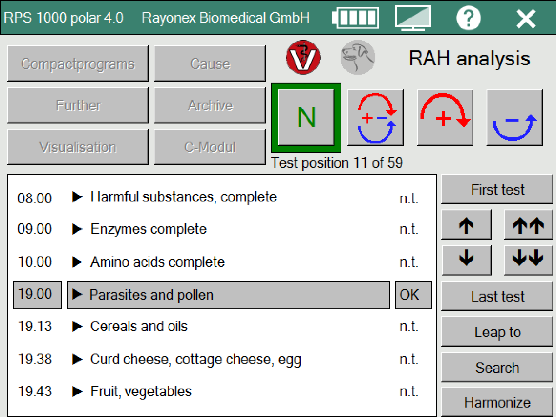 The module provides the Rayocomp PS 1000 polar 4.0 with a compilation of 21 superordinate areas and a total of 698 RAH programs in the RAH 11.00 to RAH 18.99 range. Level testing allows users to click on the Rayotensor to jump from superordinate areas to detailed areas and perform tests. This allows the energetic testing of harmful substances to be carried out quickly and safely.